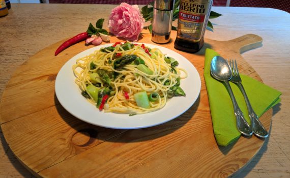Exotisch-voll-lecker! Für 4 Port. 750 g weißer o. grüner Spargel(oder gemischt), Salz, 1 TL Zucker, 1 rote Chilischote 2 Knoblauchzehen 1 Bd. Lauchzwiebeln 1 Bio –Limette 1 Bd. Zitronenmelisse 400g Dinkelvollkorn Spaghetti (oder normale bei Grünspargel) Bärlauchnudeln bei weißem Spargel (man kann auch beide Spargelsorten verwenden und normale Bandnudeln wählen.) […]